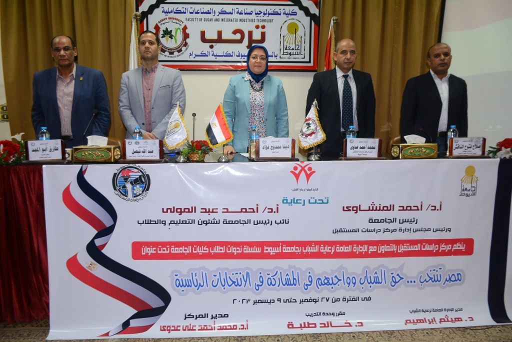 وفي هذا الاطار، نظم مركز دراسات المستقبل، بالتعاون مع الإدارة العامة لرعاية الشباب بالجامعة، الأربعاء الموافق ٢٩ من نوفمبر؛ ندوة تثقيفية بعنوان: "مصر تنتخب .. حق الشباب، وواجبهم في المشاركة في الانتخابات الرئاسية" بكلية تكنولوجيا صناعة السكر والصناعات التكاملية، وذلك ضمن سلسلة الندوات التي ينظمها المركز؛ لتوعية الطلاب، والطالبات حول الانتخابات الرئاسية.