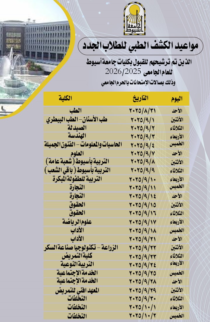 جدول مواعيد الكشف الطبي للطلاب الجدد (جامعة أسيوط 2025/2026). 21 أغسطس 2025 جدول مواعيد الكشف الطبي للطلاب الجدد (جامعة أسيوط 2025/2026). الموقع الرسمي لخدمات التحصيل الإلكتروني لخدمات جامعة أسيوط https://www.mis.aun.edu.eg/mpay/S/Index/11903