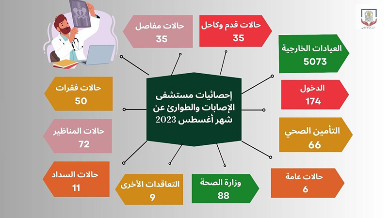 وسجل مستشفى الإصابات والطوارئ (١٧٤) حالة دخول بالاقسام الداخلية، وأجرى المستشفى (٧٢) حالة منظار، واستقبل (٨٨) حالة وزارة صحة، بالإضافة إلى استقبال (٦٦) حالة تأمين صحي، و(١١) حالات سداد، و(٦) حالات عامة، و(٩) تعاقدات أخرى، كما تم إجراء (٥٠) عملية فقرات، و(٣٥) عملية مفصل، و(٣٥) عملية قدم وكاحل، خلال الشهر نفسه.
