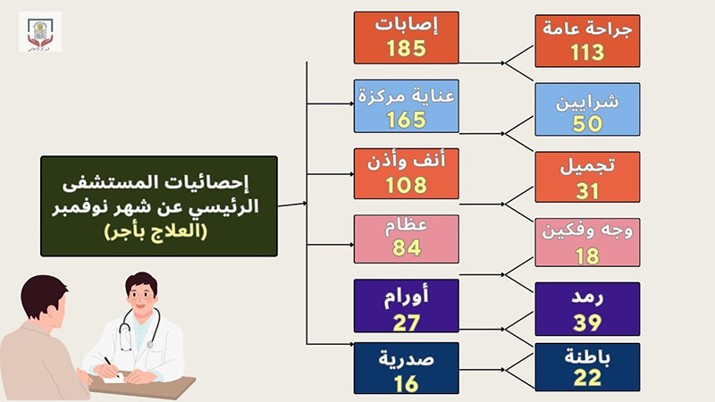 وأعلن المستشفى عن استقبال ١٨٥ حالة دخول بقسم الإصابات، و١٦٥ حالة دخول بالعناية المركزة، و١١٣ حالة بقسم الجراحة العامة، إلى جانب تسجيل ١٠٨ حالة دخول بقسم الأنف والأذن والحنجرة، و٥٠ حالة دخول بقسم الشرايين خلال الشهر نفسه.