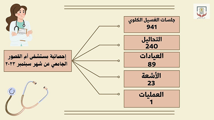وسجل مستشفى أم القصور بجامعة أسيوط (٨٩) متردداً على العيادات الخارحية، وتم إجراء (٢٤٠) تحليلاً، و(٢٣)حالة أشعة خلال الشهر نفسه.