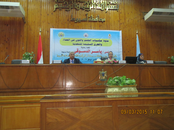- · وحاضر في الندوة السيد الأستاذ الدكتور/ محروس عثمان أحمد - وكيل الكلية لشئون خدمة المجتمع وتنمية البيئة - حيث كان محور الندوة هو إلقاء الضوء على دور الألوان الصناعية والمواد ذات نكهة في صناعة الدواء والغذاء، واحتواء بعض الأدوية والأغذية على نكهة معينة تكون القاسم بين أفضليتها من عدمه، والاهتمام بنسبه الأمان والصلاحية بالنسبة للألوان والمواد المنكهه التي تعطى النكهة حتى تؤدى الغرض من إضافتها. كما تم استعراض بعض الأعراض الجانبية لبعض الألوان الصناعية التي تمت الدراسة البحثية عليها. كما تم الإجابة على عدة أسئلة من السادة الحضور حول موضوع الندوة.