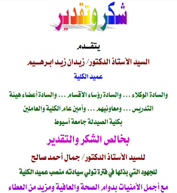 كلية الصيدلة تتقدم بخالص الشكر والتقدير للسيد الأستاذ الدكتور/ جمال أحمد صالح للجهود التي بذلها في فترة تولي سيادته منصب عميد الكلية. 1 أغسطس 2013 كلية الصيدلة تتقدم بخالص الشكر والتقدير للسيد الأستاذ الدكتور/ جمال أحمد صالح للجهود التي بذلها في فترة تولي سيادته منصب عميد الكلية.