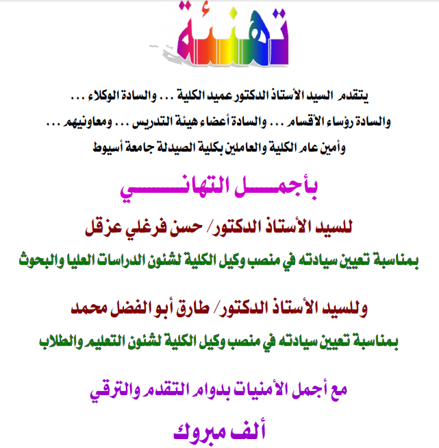 كلية الصيدلة تتقدم بخالص التهنئة للسيد الأستاذ الدكتور/ حسن فرغلي عزقل بمناسبة تعيين سيادته في منصب وكيل الكلية لشئون الدراسات العليا والبحوث ، وللسيد الأستاذ الدكتور/ طارق أبو الفضل محمد بمناسبة تعيين سيادته في منصب وكيل الكلية لشئون التعليم والطلاب.