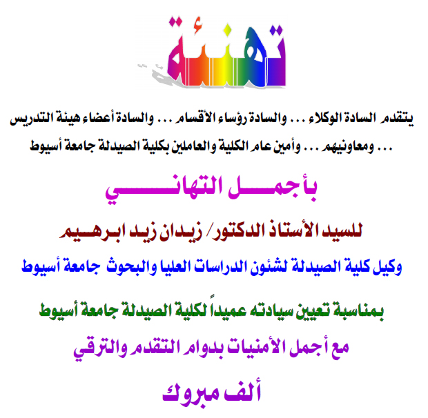 كلية الصيدلة تتقدم بخالص التهنئة للسيد الأستاذ الدكتور/ زيدان زيد ابرهيم لإنتخاب سيادته عميداً لكلية الصيدلة.