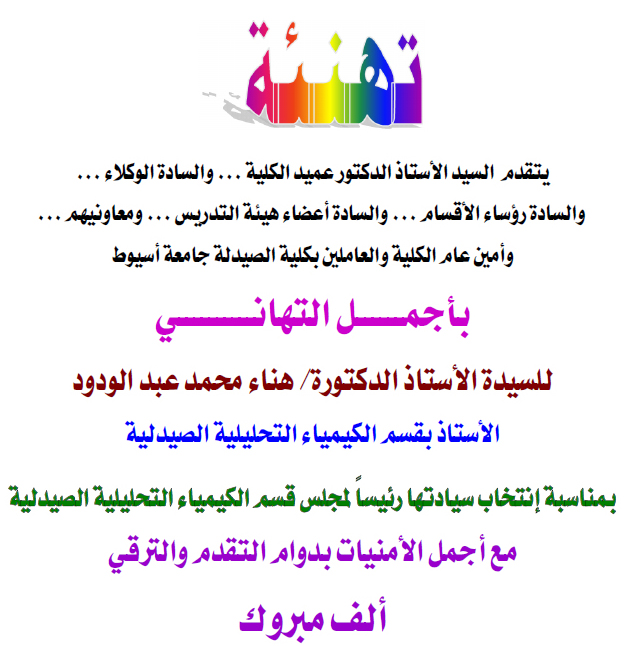 كلية الصيدلة تتقدم بخالص التهنئة للسيدة الأستاذ الدكتورة/ هناء محمد عبد الودود لإنتخاب سيادتها رئيساً لمجلس قسم الكيمياء التحليلية الصيدلية. 1 أغسطس 2013 كلية الصيدلة تتقدم بخالص التهنئة للسيدة الأستاذ الدكتورة/ هناء محمد عبد الودود لإنتخاب سيادتها رئيساً لمجلس قسم الكيمياء التحليلية الصيدلية.