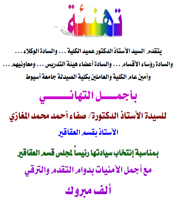 كلية الصيدلة تتقدم بخالص التهنئة للسيدة الأستاذ الدكتورة/ صفاء أحمد المغازي لإنتخاب سيادتها رئيساً لمجلس قسم العقاقير. 1 أغسطس 2013 كلية الصيدلة تتقدم بخالص التهنئة للسيدة الأستاذ الدكتورة/ صفاء أحمد المغازي لإنتخاب سيادتها رئيساً لمجلس قسم العقاقير.