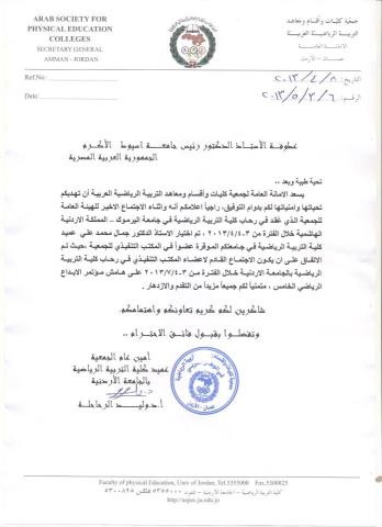 كلية التربية الرياضية بجامعة اسيوط اصبحت عضوا في جمعية كليات ومعاهد التربية الرياضية علي مستوي الوطن العربي ومقرها الاردن وعلي هامش المؤتمر الذي عقد بجامعة اليرموك يوم 4 مارس عقد اجتماع عمداء كليات التربية الرياضية بالوطن العربي وتم تشكيل المكتب التنفيذي والذى ضمن (8) عمداء من ثمانية دول وتم اختيار الدكتور جمال محمد علي عضوا بالمكتب التنفيذي لجمعية كليات التربية الرياضية بالاضافة لاعضاء من العراق/تونس/الامارات/السودان/ الجزائر/فلسطين/الاردن