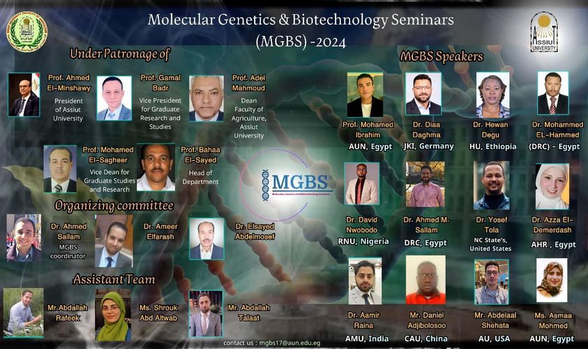 تحت رعاية الدكتور أحمد المنشاوي؛ رئيس جامعة أسيوط، أعلن قسم الوراثة بكلية الزراعة بالجامعة؛ عن تنظيم مجموعة من السيمنارات الدولية MGBS 2024 ؛ في مجاليّ؛ الوراثة، والبيوتكنولوجي، وذلك فى الفترة من 15/4/2024 ، وحتى 1/7/2024؛ يأتى ذلك تحت إشراف الدكتور جمال بدر نائب رئيس الجامعة لشئون الدراسات العليا والبحوث، والدكتور عادل محمود ونان عميد الكلية، والدكتور بهاء الدين السيد عبدالفتاح رئيس القسم.