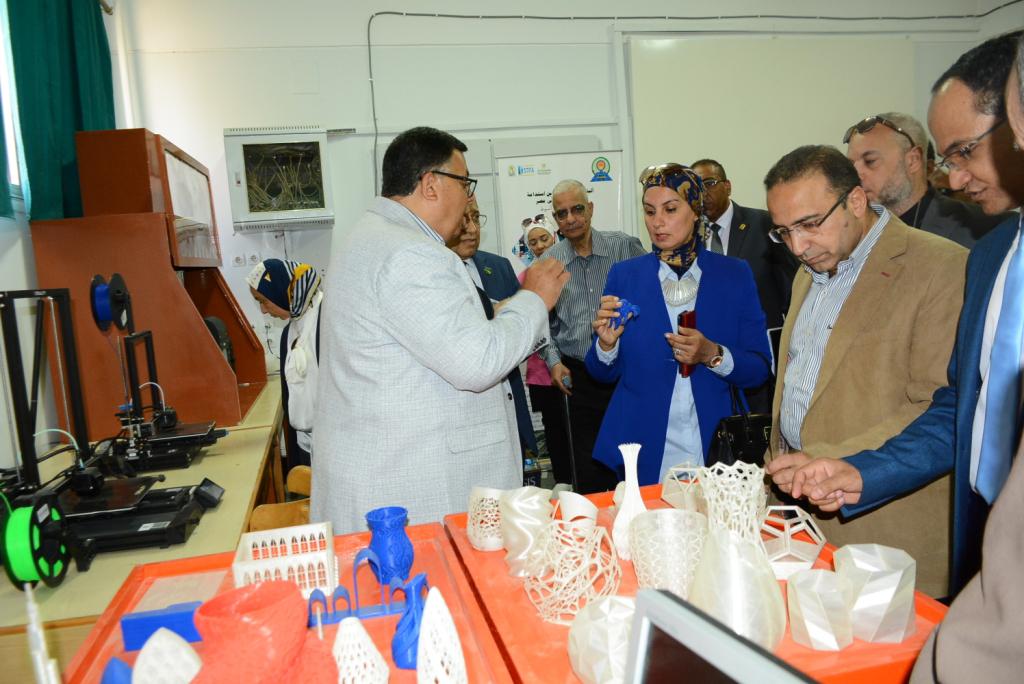 أعقب ذلك، قيام اللجنة بزيارة كلية الهندسة، وكان في استقبالهم الدكتور محمد صفوت وكيل الكلية لشئون خدمة المجتمع وتنمية البيئة، والدكتور وليد أبو الوفا منسق برنامج هندسة التشييد وإدارة المشروعات والمشرف علي ورش كلية الهندسة، والدكتور عزت عبد المنعم مرغني وكيل الكلية لشئون التعليم والطلاب والقائم بعمل رئيس قسم العمارة، حيث تم تفقد قسم الهندسة المعمارية، ومعمل العمارة الذكية المستدامة بحضور الدكتور ربيع محمد رفعت أستاذ العمارة وتكنولوجيا المعلومات بقسم العمارة و الباحث الرئيسي للمشروع، كما تفقدت اللجنة معمل الطاقة الشمسية بحضور الدكتور أحمد حمزة الحسيني رئيس قسم هندسة القوي الميكانية المشرف على المعمل، فضلاً عن تفقد معمل الطاقة الجديدة والمتجددة تحت إشراف الدكتور محمد عبد العظيم نايل رئيس قسم الكهرباء وكان فى استقبالهم الدكتور مازن عبد السلام و الدكتور عادل عبده.