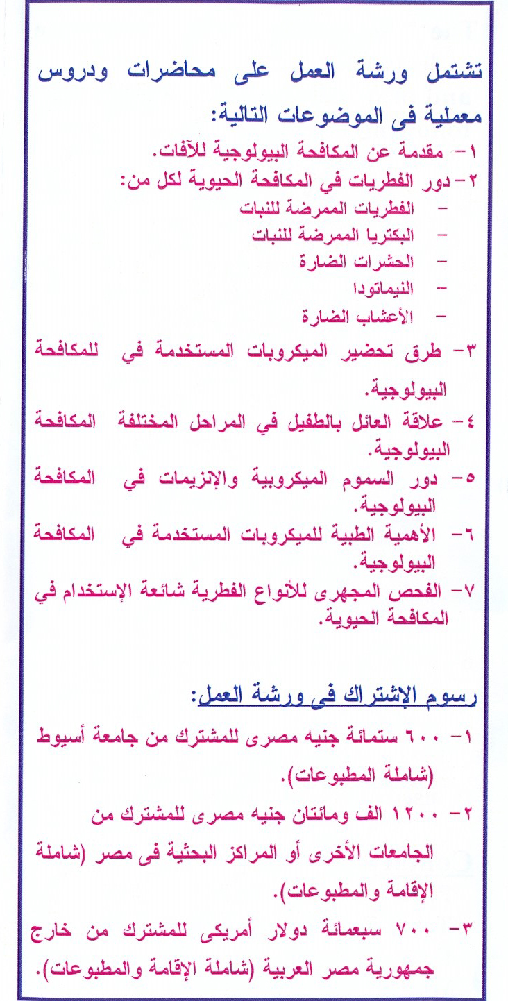 محتوي ورشة عمل بعنوان " تنوع الحيوان للفطريات التى تستخدم فى المكافحه الحيويه لآفات وأمراض النبات "