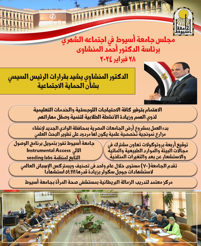 واستعرض مجلس جامعة أسيوط؛ أهم الأنشطة والأحداث البارزة خلال شهر فبراير 2024 أهمها، تقدم الجامعة فى تصنيف ويبمتركس الأسباني لاستشهادات جوجل سكولر بزيادة قدرها 51.111 استشهاداً، بتقدم 70 مركز خلال عام واحد فى التصنيف الإسباني العالمي، القيام بتجديد وتطوير نادي الجامعة؛ لرفع كفاءته، وتحسين خدماته، وتطوير نشاطه.