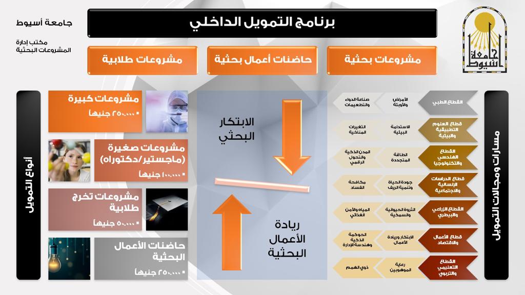 صرح الدكتور أحمد المنشاوي رئيس الجامعة: إن مكتب إدارة المشروعات البحثية بجامعة أسيوط، أعلن عن فتح باب التقدم لبرامج التمويل الداخلي؛ بهدف ربط البحث العلمي بخدمة القطاعات التنموية المختلفة، والتي تأتي تماشيا مع ما تبذله جامعة أسيوط من جهود كبيرة؛ لتحفيز البحث العلمي، وربطه بقضايا التنمية الشاملة.