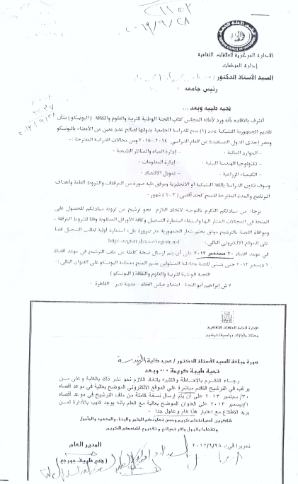 قد ورد للإدارة المركزية للعلاقات الثقافية ولأمانة المجلس كتاب اللجنة الوطنية للتربيةوالعلوم الثقافة بشأن تقديم الجمهورية التشيكية عدد (1 )منح للدراسة الجامعية بدولتها لصالح عدد معين من الأعضاء باليونسكو ومصر احدى الدول المستفيدة عن العام الدراسى 2014-2015 ومن مجالات الدراسة المفتوحة :-ن