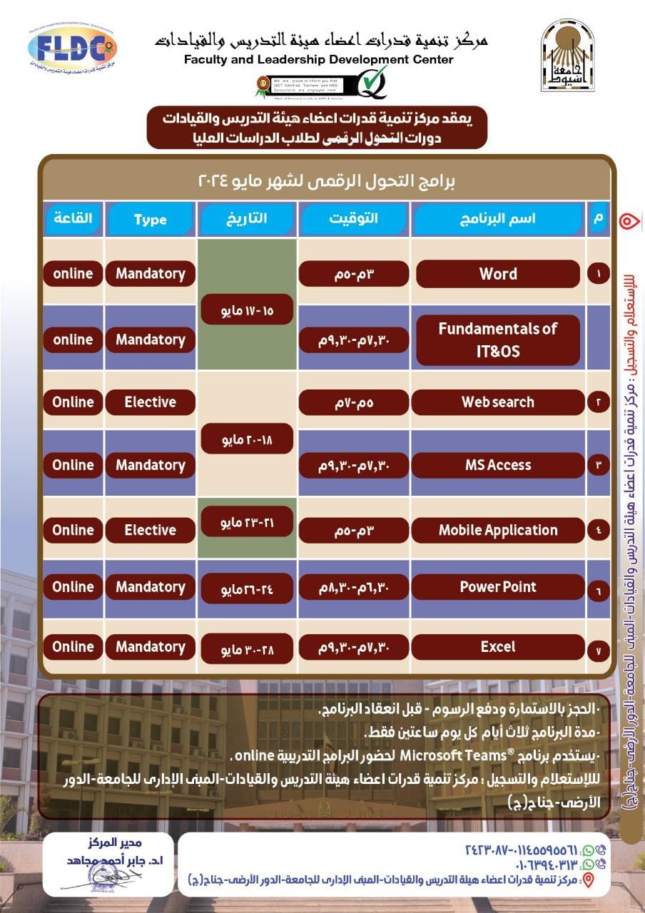 يعلن مركز تنمية قدرات أعضاء هيئة التدريس والقيادات بجامعة أسيوط، بدء التسجيل في دورات "التحول الرقمي لطلاب الدراسات العليا"، تحت رعاية الدكتور أحمد المنشاوي رئيس جامعة أسيوط، وإشراف الدكتور جابر أحمد مجاهد مدير المركز.