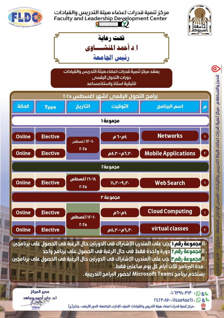 يُعلن مركز تنمية قدرات أعضاء هيئة التدريس والقيادات بجامعة أسيوط عن بدء التسجيل في البرنامج التدريبي لدورات "التحول الرقمي"، المخصصة لأعضاء هيئة التدريس المتقدمين للترقية إلى درجتي أستاذ وأستاذ مساعد، وذلك تحت رعاية الدكتور أحمد المنشاوي رئيس الجامعة، وبإشراف الدكتور جابر أحمد مجاهد مدير المركز.
