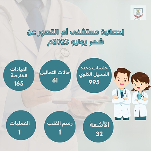 أعلن مستشفى أم القصور بجامعة أسيوط، إجراء (٩٩٥) جلسة غسيل كلوي خلال شهر يوليو الماضي، تحت رعاية الدكتور أحمد المنشاوي رئيس الجامعة، والدكتور علاء عطية القائم بأعمال عميد كلية الطب ورئيس مجلس إدارة المستشفيات الجامعية، والدكتور إيهاب فوزي المدير التنفيذي للمستشفيات الجامعية، والدكتور عامر رجب أحمد مدير المستشفى، وبإشراف الدكتورة عفت عبدالهادي رئيس وحدة الكلى الصناعي بالمستشفيات الجامعية.