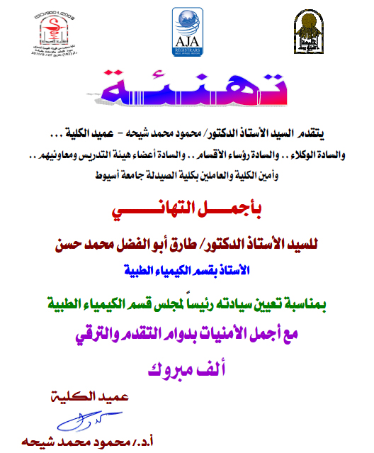 عميد كلية الصيدلة وأسرة الكلية يقدمون خالص التهنئة للسيد الأستاذ الدكتور: طارق أبو الفضل محمد حسن بمناسبة تعيين سيادته رئيساً لمجلس قسم الكيمياء الطبية بكلية الصيدلة.