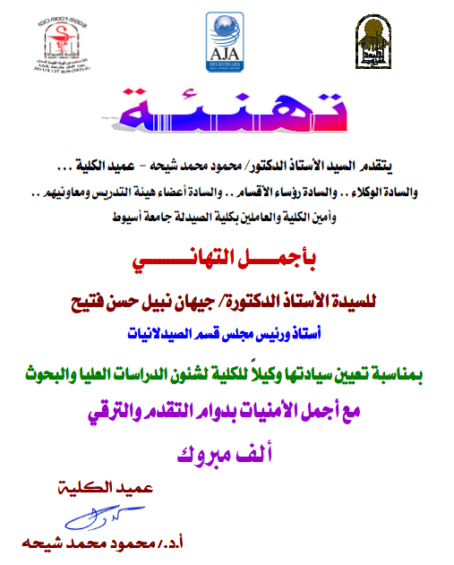 عميد كلية الصيدلة وأسرة الكلية يقدمون خالص التهنئة للسيدة الأستاذ الدكتورة: جيهان نبيل حسن فتيح بمناسبة تعيين سيادتها وكيلاً لكلية الصيدلة لشئون الدراسات العليا والبحوث.