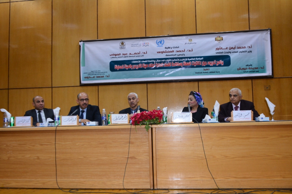 تحت رعاية الدكتور أيمن عاشور وزير التعليم العالي والبحث العلمي والدكتور أحمد المنشاوي القائم بعمل رئيس جامعة أسيوط شارك الدكتور أحمد عبد المولي القائم بعمل نائب رئيس الجامعة لشئون التعليم والطلاب في إنطلاق فعاليات البرنامج التدريبي حول أخلاقيات المهنة ومكافحة الفساد للسادة أعضاء هيئة التدريس والهيئة المعاونة في إطار المبادرة العالمية للتعليم وتمكين الشباب في مجال مكافحة الفساد وذلك بحضور الدكتورة مديحة درويش عميد كلية الطب البيطري وممثل لجنة الأخلاقيات بالجامعة, الدكتور محمد عدوي وكيل كلية التجارة لشئون التعليم والطلاب, الدكتور حسن عبد الصبور وكيل كلية الطب البيطري لشئون خدمة المجتمع وتنمية البيئة, الدكتور محمود عبد العليم أستاذ النساء والتوليد ومقرر لجنة أخلاقيات البحث العلمي بالجامعة, فضلاً عن نخبة من عمداء ووكلاء وأعضاء هيئة التدريس من مختلف كليات الجامعة , وبمشاركة طلاب وطالبات الجامعة .