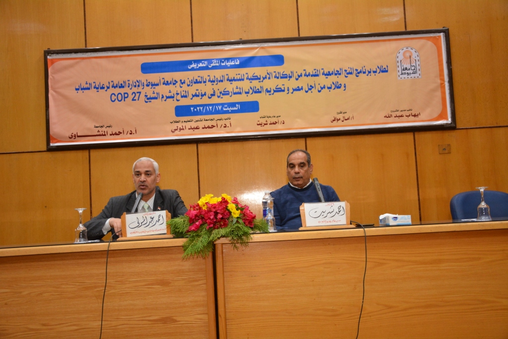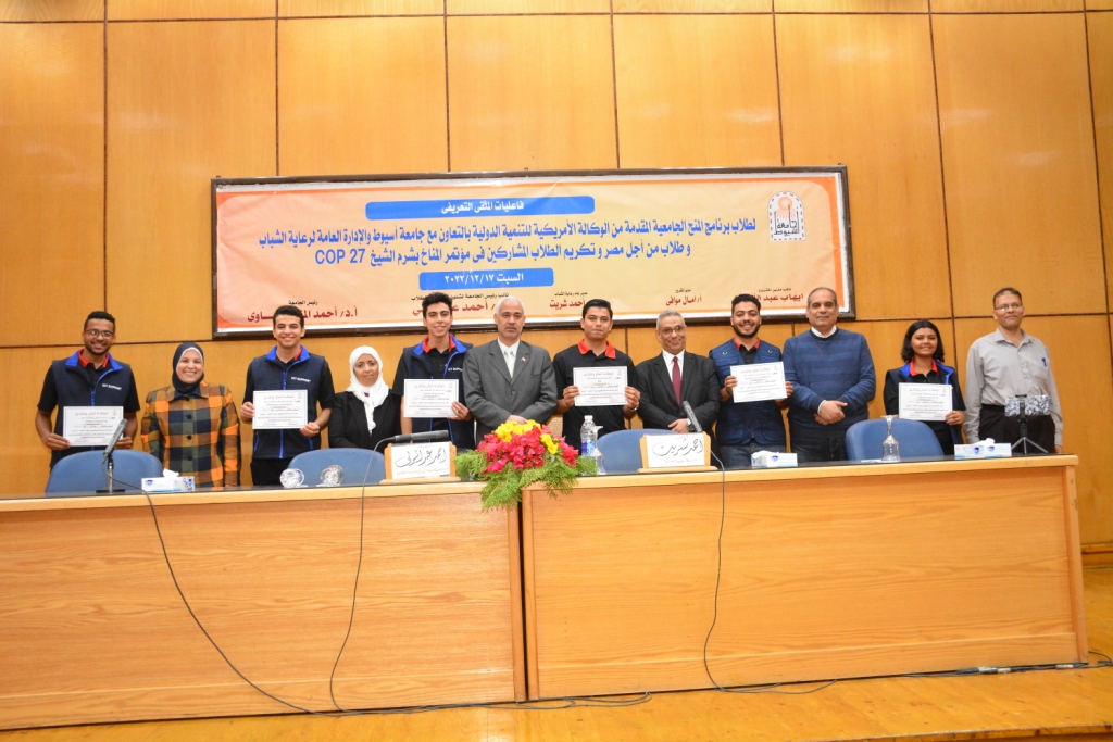 تحت رعاية الدكتور أحمد المنشاوي القائم بعمل رئيس جامعة أسيوط شارك الدكتور أحمد عبد المولي القائم بعمل نائب رئيس الجامعة لشئون التعليم والطلاب في فعاليات الملتقي التعريفي لطلاب برنامج المنح الجامعية المقدمة من الوكالة الأمريكية للتنمية الدولية بالتعاون مع جامعة أسيوط والإدارة العامة لرعاية الشباب وأسرة طلاب من أجل مصر وتكريم الطلاب المشاركين في مؤتمر المناخ بشرم الشيخ cop 27 وذلك بحضور الدكتورة تيسير سليمان عميد كلية الحاسبات والمعلومات , والدكتور علاء عبد الحفيظ عميد كلية التجارة , الدكتور خالد فتحي وكيل كلية الحاسبات لشئون التعليم والطلاب , الدكتورة فاطمة رشدي وكيل كلية التمريض لشئون التعليم والطلاب , والدكتور أحمد شريت مدير عام الإدارة العامة لرعاية الشباب المركزية , والدكتورة نادية عبد الغني مدير برنامج التمريض التخصصي , والأستاذة داليا جمال حامد منسق برنامج المشروع , والأستاذة امال موافي مدير المشروع , والأستاذ إيهاب عبد الله القائم بأعمال مدير برنامج المنح الجامعية , فضلاً عن حضور السادة أعضاء هيئة التدريس , وبمشاركة أكثر من 50 طالب وطالبة من أبناء الجامعة .