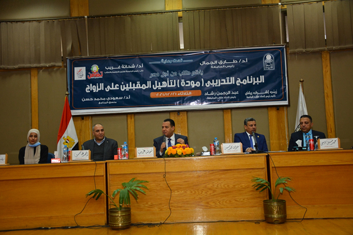 وفى مستهل كلمته فقد أكد الدكتور شحاتة غريب على حرص إدارة الجامعة تحت قيادة الدكتور طارق الجمال رئيس الجامعة على رفع وعى الشباب بكافة أمور حياتهم وتغيير مفاهيمهم الخاطئة والتى من الممكن ان تدمر حياتهم وتشكل عقبة فى تحقيق أحلامهم وطموحاتهم ، وفى هذا الشأن ، فقد أشاد نائب رئيس الجامعة بفكرة برنامج " مودة" والذى نظمته وزارة التضامن الإجتماعى بعد تكليفها من قبل الرئيس عبدالفتاح السيسى رئيس الجمهورية خلال مؤتمر الشباب عام 2018 بضرورة دراسة أسباب زيادة معدلات الطلاق فى مصر والبحث فى تداعيات هذا الأمر وتأثيره على كيان الأسرة ، مشيراً إلى دعم إدارة الجامعة الكامل لهذا البرنامج التدريبى والهادف إلى الحد من نسب الطلاق فى مصر توفير معارف أساسية للمقبلين على الزواج ، منوهاً فى ختام كلمته ان هذا البرنامج يأتى كتأكيد على ما تناوله الدستور المصرى والذى نص على ان الأسرة هى أساس المجتمع.
