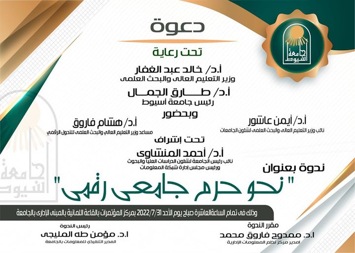 أعلن الدكتور طارق الجمال رئيس جامعة أسيوط عن استقبال الجامعة يوم الأحد القادم 31 يوليو 2022 لزيارة هامة للدكتور أيمن عاشور نائب وزير التعليم العالى والبحث العلمى لشئون الجامعات والدكتور هشام فاروق مساعد وزير التعليم العالى للتحول الرقمى وذلك فى زيارة موسعة لمتابعة جهود الجامعة فى مجال التحول الرقمى وما حققته من إنجازات فى هذا المجال.