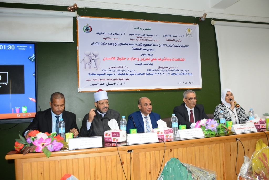 تحت رعاية الدكتور أحمد المنشاوى رئيس جامعة أسيوط، نظمت كلية التجارة بالجامعة، بالتعاون مع وحدة حقوق الإنسان، بديوان عام المحافظة، اليوم الثلاثاء 31 من أكتوبر ندوة تثقيفية وتوعوية حول"الشائعات وتأثيرها على تعزيز واحترام حقوق الإنسان".