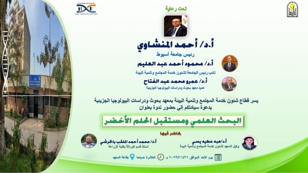 ينظم قطاع شئون خدمة المجتمع وتنمية البيئة بمعهد بحوث ودراسات البيولوجيا الجزيئية، جامعة أسيوط، ندوة بيئية بعنوان " البحث العلمي ومستقبل الحلم الاخضر"