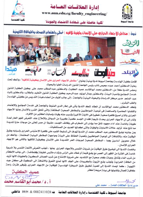 ندوة ( مخاطر الإجهاد الحرارى على الإنسان وكيفية تلافيه ) تحظى باهتمام الصحف والمواقع الإلكترونية 3 سبتمبر 2015 ندوة ( مخاطر الإجهاد الحرارى على الإنسان وكيفية تلافيه ) تحظى باهتمام الصحف والمواقع الإلكترونية
