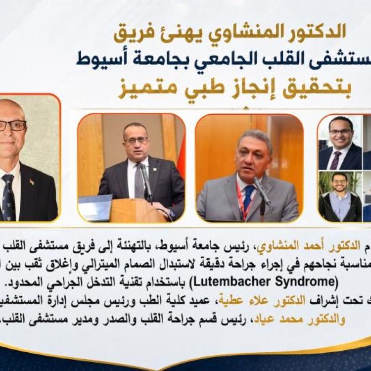 الدكتور المنشاوي يهنئ فريق مستشفى القلب بجامعة أسيوط بنجاح إجراء أول جراحة دقيقة لاستبدال الصمام الميترالي وإغلاق ثقب بين الأذينين (Lutembacher Syndrome) باستخدام تقنية التدخل الجراحي المحدود