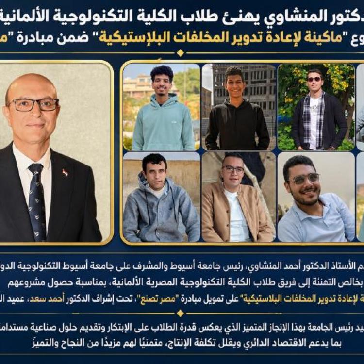 الدكتور المنشاوي يهنئ طلاب جامعة أسيوط التكنولوجية الدولية بحصول مشروع "ماكينة لإعادة تدوير المخلفات البلاستيكية" على تمويل مبادرة "مصر تصنع"