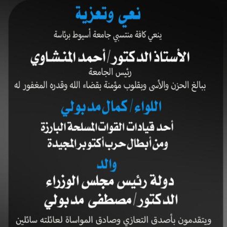 الدكتور المنشاوي ينعى اللواء كمال مدبولي والد دولة رئيس مجلس الوزراء ويشيد بعطائه الوطني