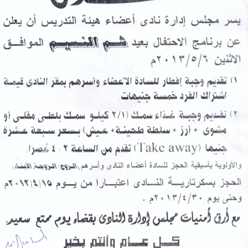 احتفلات نادى اعضاء هيئة التدريس بشم النسيم للسادة اعضاء هيئة التدريس