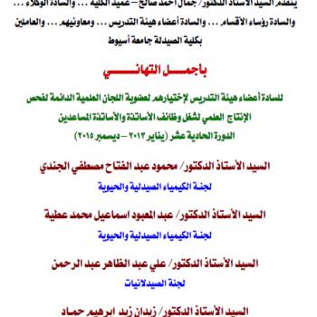 تهنئة من كلية الصيدلة لبعض الأساتذة لإختيارهم لعضوية اللجان العلمية الدائمة لفحص الإنتاج العلمي لشغل وظائف الأساتذة والأساتذة المساعدين الدورة الحادية عشر.