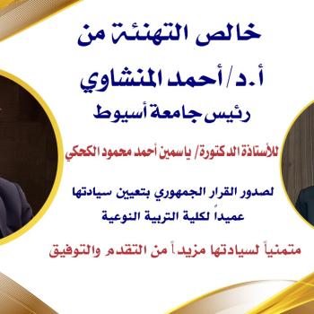 الدكتور المنشاوي يهنئ الدكتورة ياسمين الكحكي لصدور القرار الجمهوري بتعيينها عميدًا لكلية التربية النوعية بجامعة أسيوط