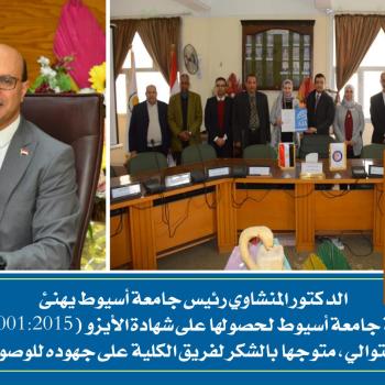 الدكتور المنشاوي رئيس جامعة أسيوط يهنئ كلية الصيدلة جامعة أسيوط لحصولها على شهادة الأيزو (9001:2015 ISO) للمرة السابعة على التوالي، متوجها بالشكر لفريق الكلية على جهوده للوصول لهذه المرحلة.