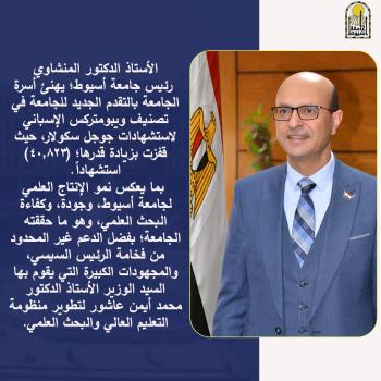 الأستاذ الدكتور أحمد المنشاوي رئيس جامعة أسيوط؛ يهنئ أسرة الجامعة بالتقدم الجديد للجامعة في تصنيف ويبومتركس الإسباني لاستشهادات جوجل سكولار، حيث قفزت بزيادة قدرها؛ (40,823) استشهاداً.