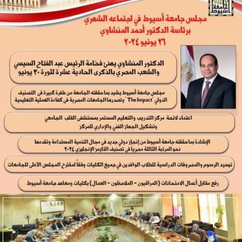 مجلس جامعة أسيوط يعقد اجتماعه الشهري برئاسة الدكتور المنشاوي:الدكتور المنشاوي يوجه التهنئة لفخامة الرئيس عبدالفتاح السيسي بالذكرى الحادية عشرة لثورة ٣٠ يونيو المجيدة