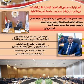 بالانفرجراف .. أهم قرارات مجلس الجامعات الأهلية خلال اجتماعة عن شهر مايو 2024 بخصوص جامعة أسيوط الأهلية