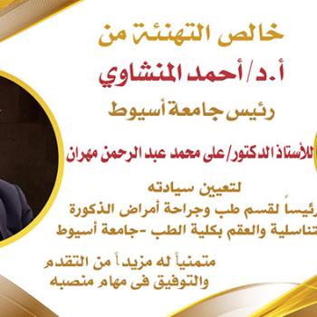 رئيس جامعة أسيوط يصدر قرارا بتعيين الدكتور علي محمد عبدالرحمن رئيسا لقسم طب وجراحة أمراض الذكورة والتناسلية والعقم بكلية الطب