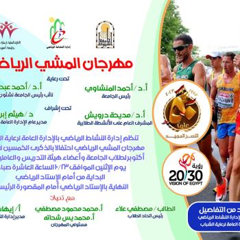 برعاية الدكتور المنشاوي.. انطلاق فعاليات مهرجان المشي بجامعة أسيوط احتفالاً بانتصارات أكتوبر المجيدة .. الإثنين 23 أكتوبر