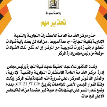 تحذير مهم من مركز الخدمة العامة للاستشارات التجارية والتنمية الإدارية بكلية التجارة - جامعة أسيوط بشأن شهادات الدورات التدريبية