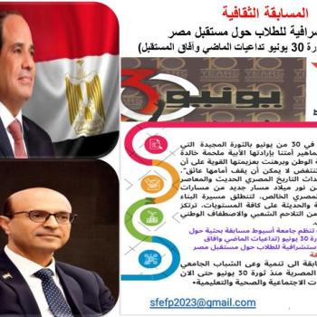 جامعة أسيوط تطلق مسابقة ثقافية عن الذكرى العاشرة لثورة 30 يونيو تحت عنوان تداعيات الماضى وآفاق المستقبل رؤى استشراقية للطلاب حول مستقبل مصر