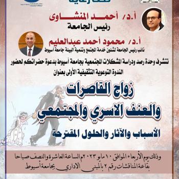 جامعة أسيوط تنظم ندوة حول " زواج القاصرات والعنف الأسري والمجتمعي: الأسباب والآثار والحلول المقترحة" 10 مايو المقبل