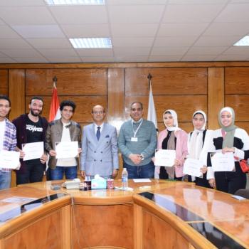 رئيس جامعة أسيوط يستقبل أعضاء الفريق الطلابي الحاصل على المركز الأول على مستوى الجامعات المصرية خلال مشاركتهم فى مسابقة هاكثون "الاستدامة و التغير المناخي" بفكرة ابتكاريه لوحدة إنتاج طاقة خضراء متنقلة