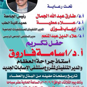 رئيس جامعة أسيوط يشهد غداَ حفل تكريم الدكتور أسامة فاروق و عدد من العاملين بوحدة الإصابات و يفتتح مقر عيادات التأمين الصحي بالمستشفيات الجامعية