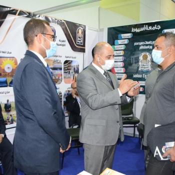 الدكتور خالد عبد الغفار وزير التعليم العالي والبحث العلمى والدكتورة نيفين جامع وزيرة التجارة والصناعة خلال تفقدهم اليوم الأحد لجناح جامعة أسيوط فى معرض التعليم العالى "أعرف كليتك"