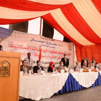 رئيس جامعة أسيوط يشهد مراسم الاحتفال بتسليم عقود الوحدات السكنية بمدينة الرحاب لنحو ٤٨٠ منتفع من أعضاء هيئة التدريس والعاملين