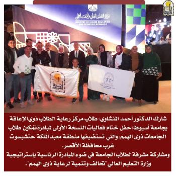الدكتور المنشاوي يشارك طلاب مركز رعاية الطلاب ذوي الإعاقة بجامعة أسيوط حفل ختام فعاليات النسخة الأولى لمبادرة تمكين طلاب الجامعات ذوى الهمم، بحضور وزير التعليم العالي والبحث العلمي الدكتور محمد أيمن عاشور، والتي تستضيفها منطقة معبد الملكة حتشبسوت غرب محاف